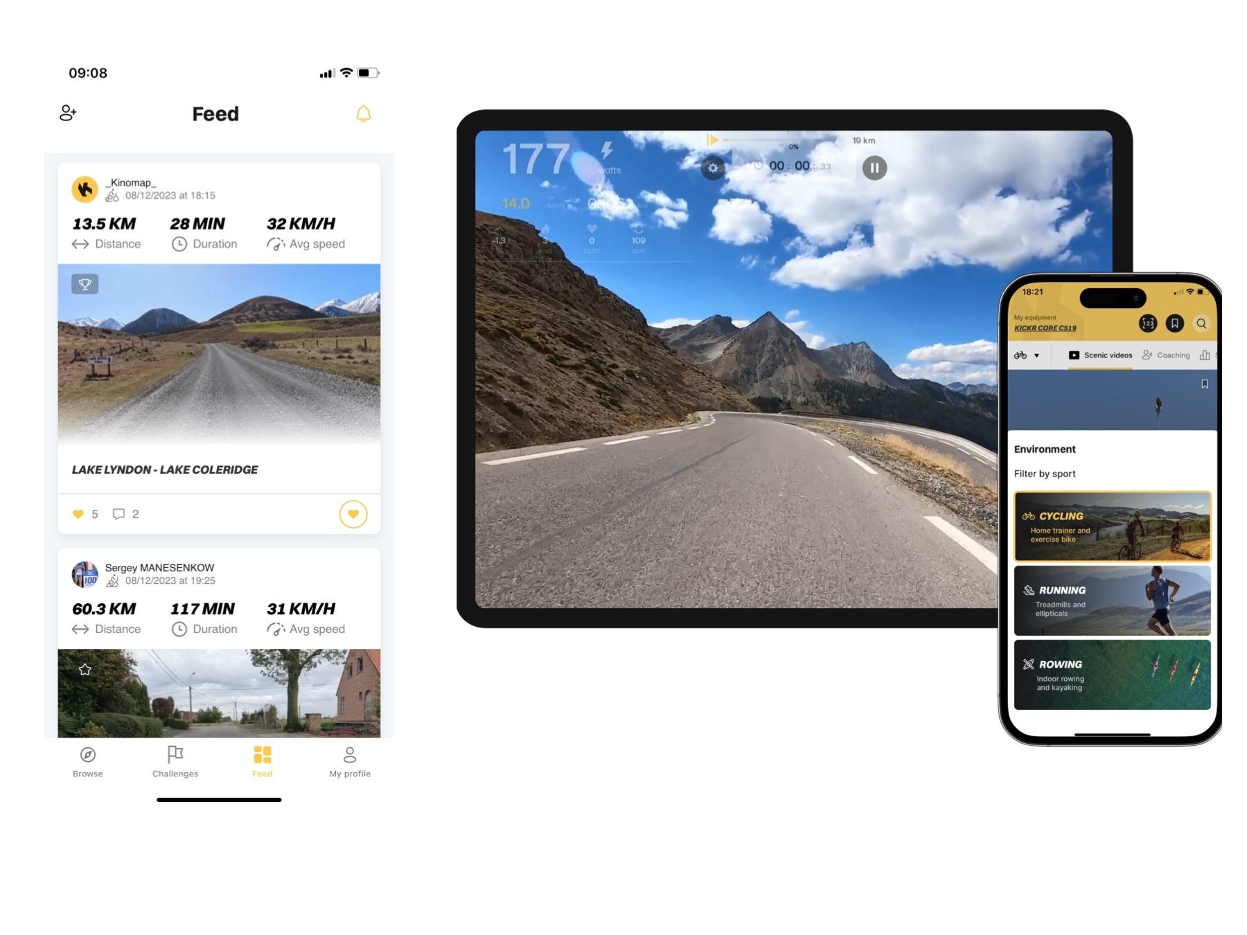 Kinomap最大の魅力は、実写によるリアリティのあるヴァーチャル体験ができることです。世界中のスポーツ愛好家が、オンライン上の実在するコースを自宅にいながら走ることができます。またKinomapのプラットフォーム上で開催されるイベントに参加することでタイムを競い合ったり、定められた日程内で既定のコースを完走するなど単なるトレーニングのみならず、ソーシャルアプリケーションとして楽しむこともできます。Kinomap のコースは、アスリートからビギナーまで幅広いサイクリスト、ランナーに利用されており、誰もが様々な場所からオンラインでリアルタイムに参加でき、新しいスポーツの魅力を発見することができます。