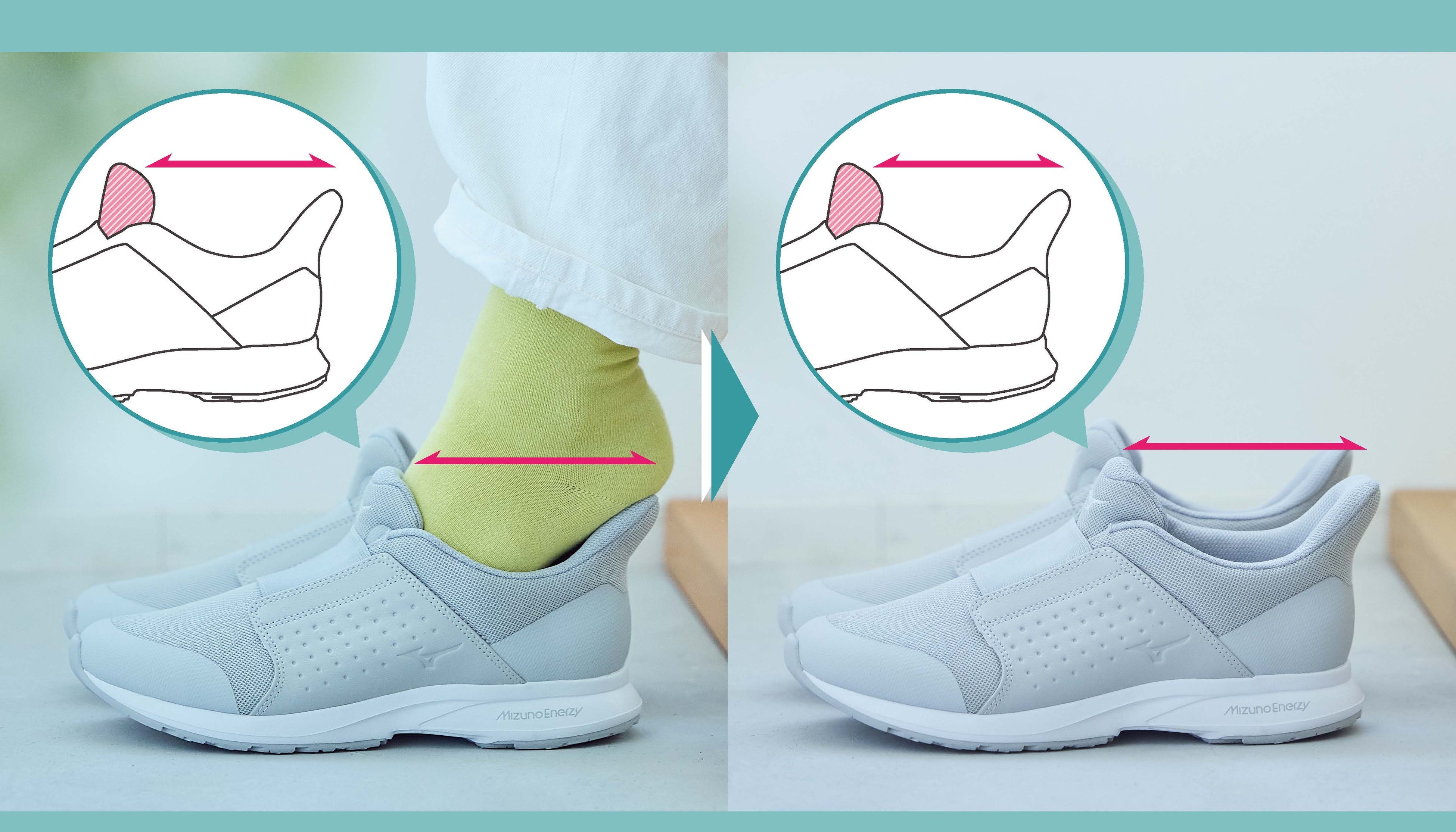 今回開発したミズノ独自の『オープンフィット構造』は、①靴を履くとき、②歩くとき、③靴を脱ぐとき、の3段階で異なる特長があり、着脱の容易さとフィット感を両立しています。※2