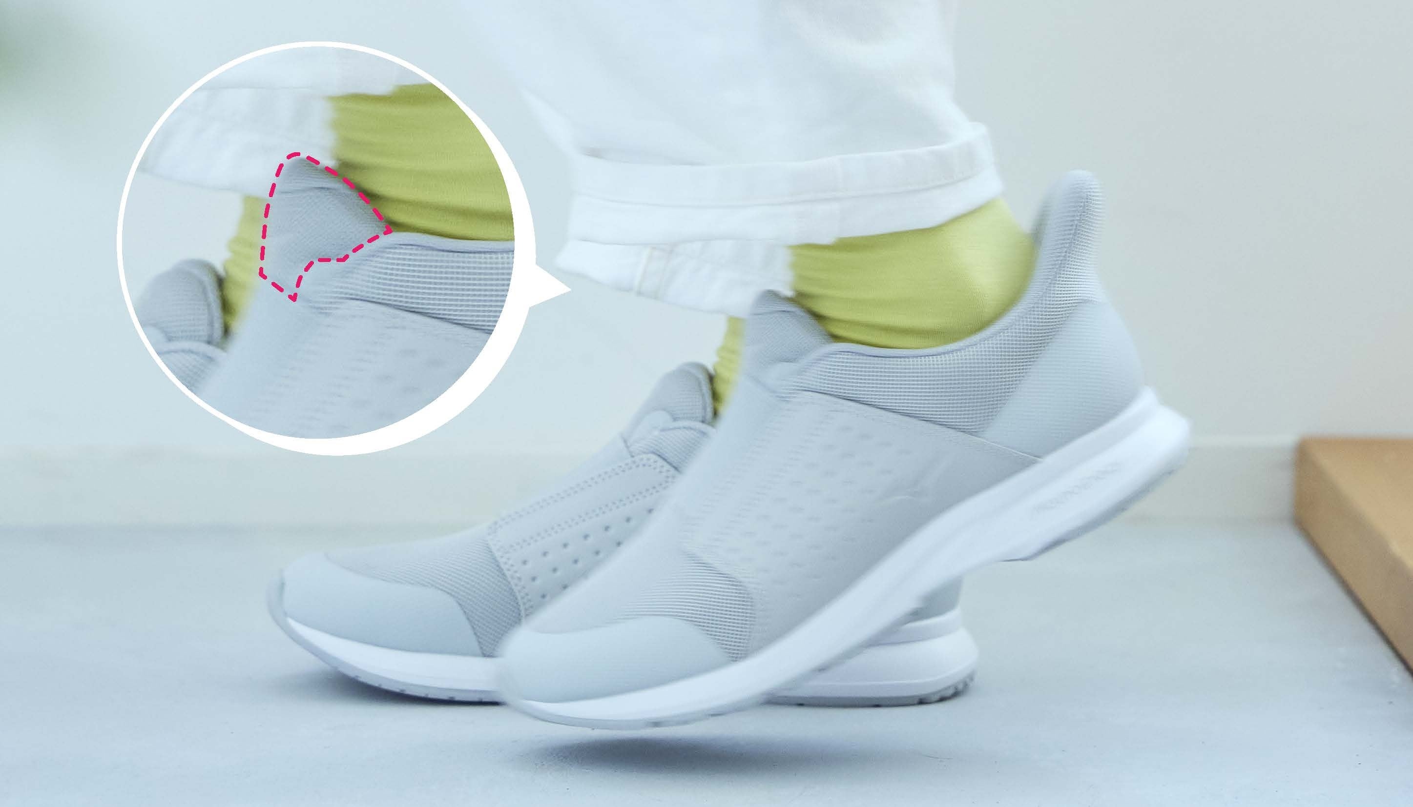 足入れ時には履き口が広がっている状態で、足を入れるとベロ部が足に沿う設計になっています。それにより、手を使ったりかがんだりすることなく、靴を履くことが可能です。