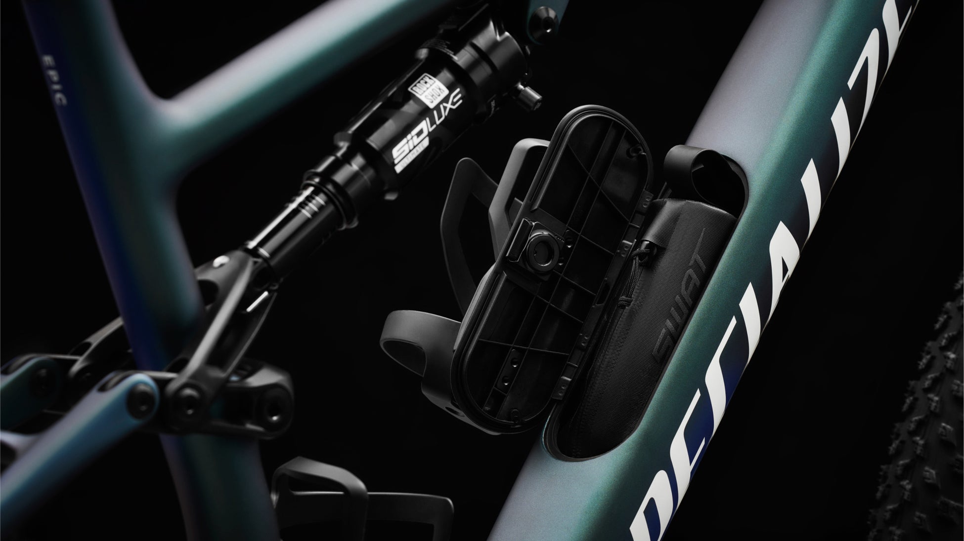 新型Epic 8はもちろん、歴代最軽量。S-Worksモデルは76g軽くなりました。それでいて効率性と走破性は高まり、新しい機能も追加しました。例えばSWAT 4.0。ライドに必須のアイテムをダウンチューブに入れて運べます。また、ステアリングストップも内蔵。転倒時にハンドルバーが回ってトップチューブに傷が入るのを防ぎます。
