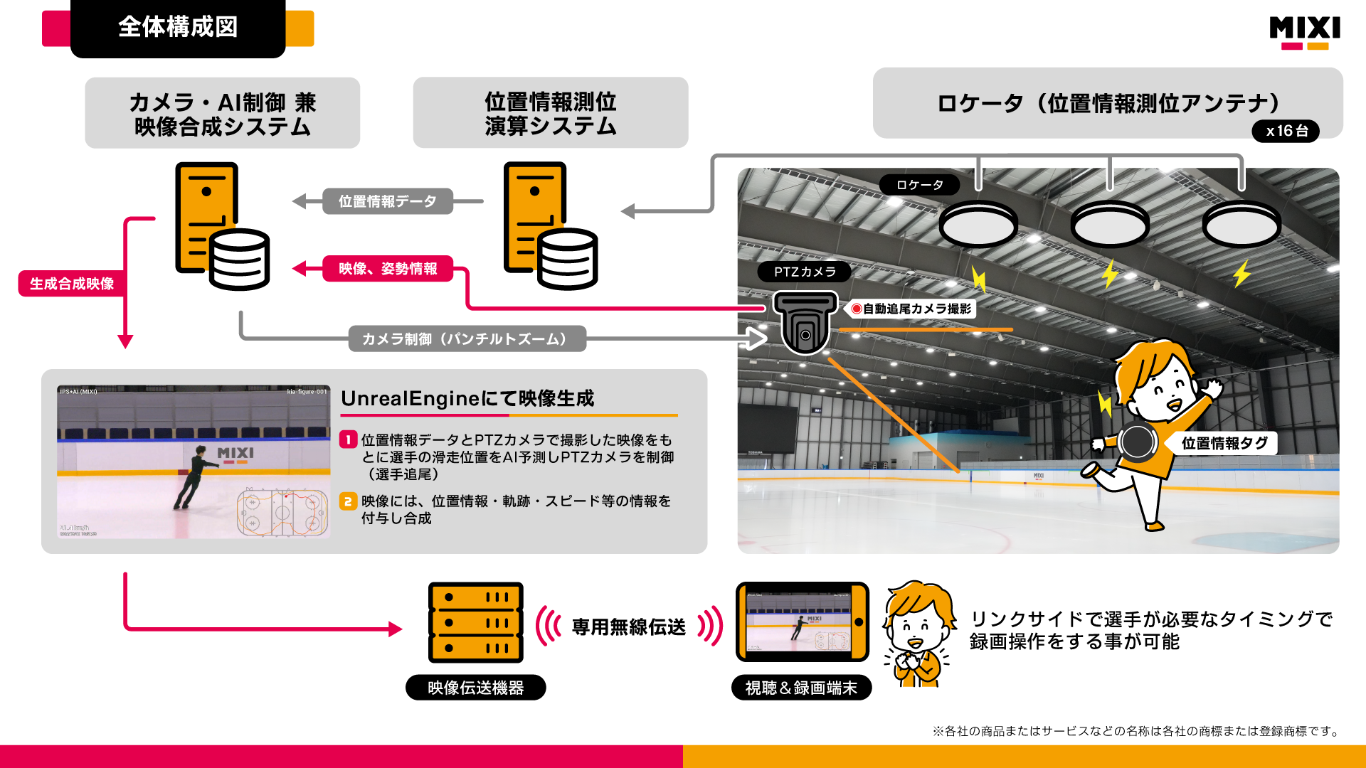 <システム概要> ① アリーナ内にロケータ(位置情報アンテナ)を16台設置し、位置情報タグをつけた選手の位置情報を測位。 ② 測位した位置情報をもとにPTZカメラで選手を自動追尾し、映像を撮影。 ③ 撮影映像は現地で閲覧可能であり、選手は自身の演技をすぐに復習することが可能。 |