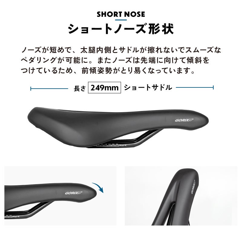 ノーズが短めで、太腿内側とサドルが擦れないでスムーズなペダリングが可能に。