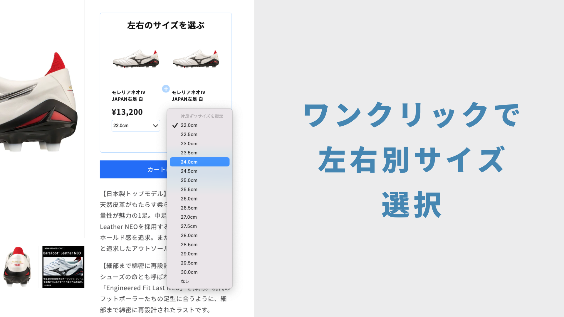 ミズノ・アシックス・ナイキ・アディダスの4ブランド、15種類の商品から自身に合うサッカースパイク/サイズを選択できます。商品ページのサイズ選択ボタンから左右別サイズを選択、注文できます。ご注文一回につき、サービス料3,480円(税込)がかかります。