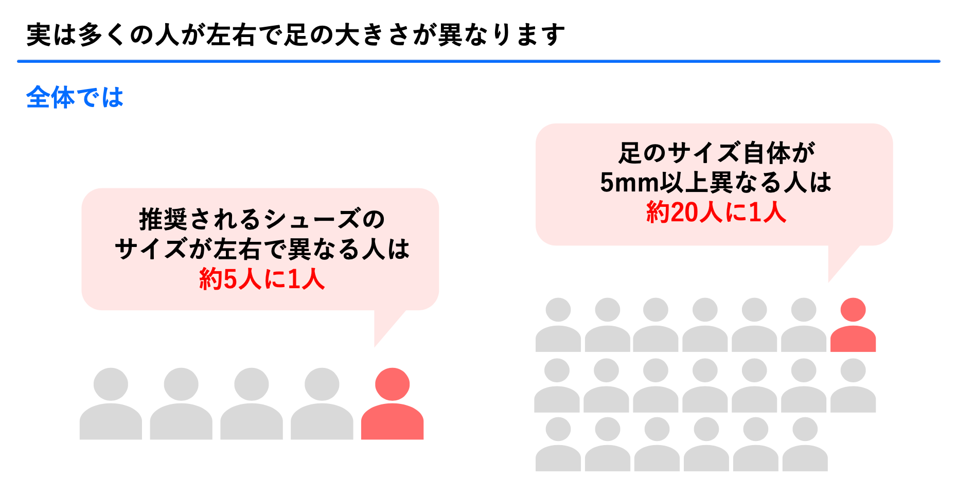 当社調べによれば、約20人に一人は左右の足に5mm以上の左右差を抱えていることがわかっています。