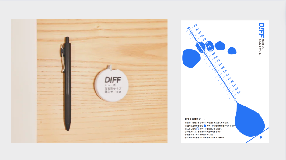 上記サイトでは、足の計測に使用できる「DIFF.オリジナルメジャー」「足サイズ計測シート(PDF)」を配布しています。