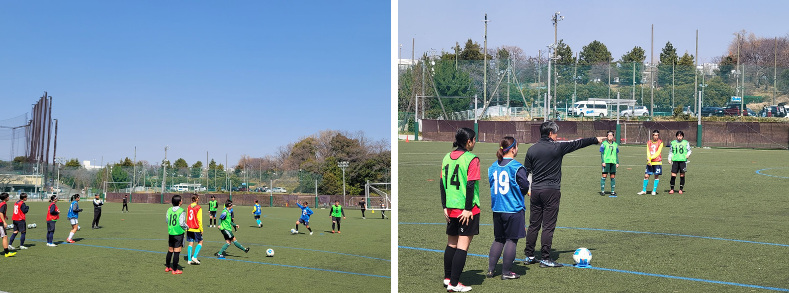 まずはウォーミングアップからスタート。緊張からか硬さが見られる選手たちに、森監督が「もう少し盛り上げていこう」と笑顔で声をかける一コマも。ボールを動かすトレーニングでは森監督が時折プレーを止め、ボールの持ち方や身体の使い方を細かく指導しておりました。