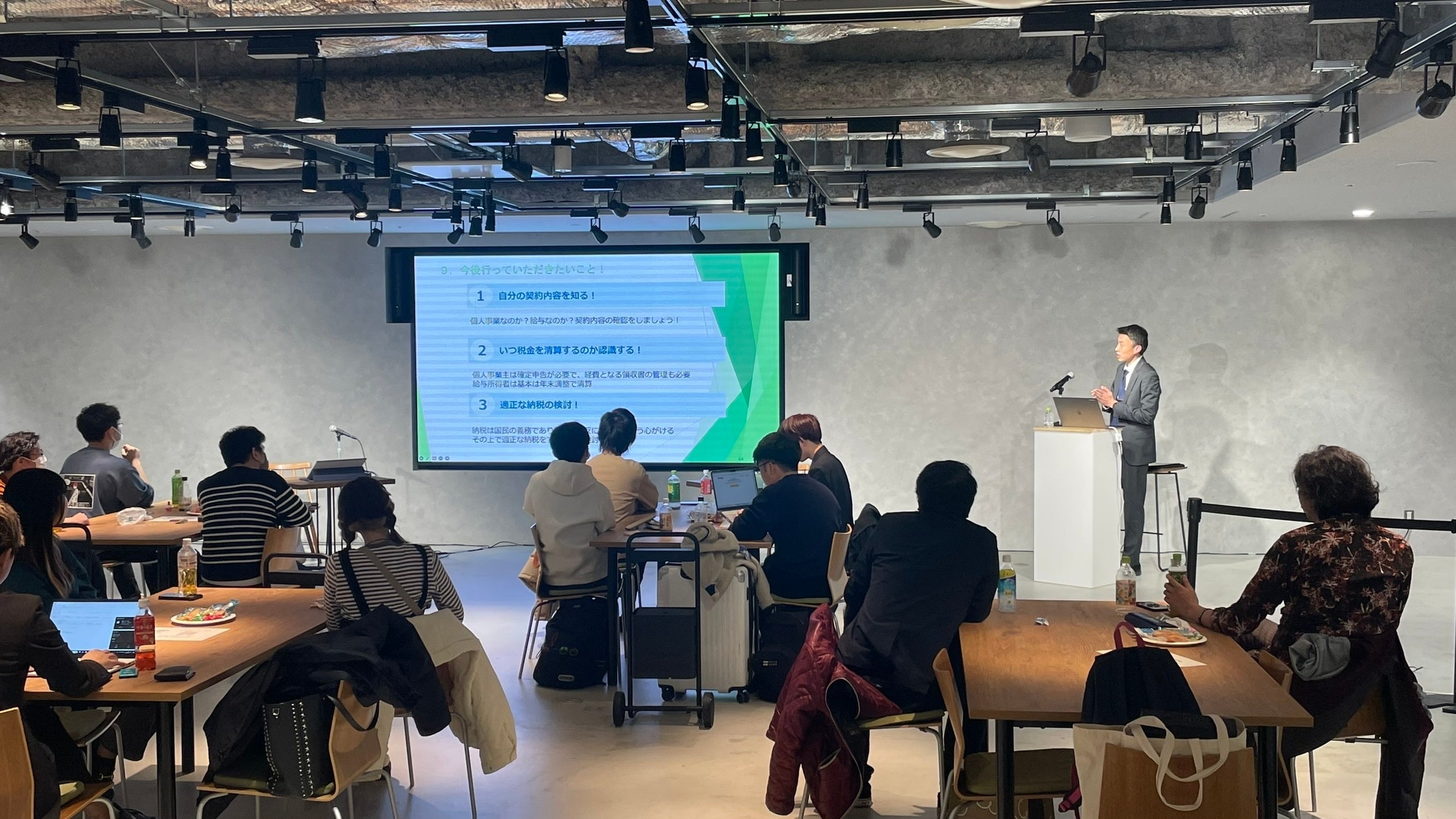 第三部には、税理士法人C Cubeコンサルティングの代表である加藤和希税理士が登壇。『税の意義と役割について』と題してセミナーを実施しました。課税対象となる収入や、プロ選手の経費例、青色申告のメリットなどについて丁寧な解説があり、個人事業主として活動することも多い選手たちが、適正な納税の重要性について理解を深めました。