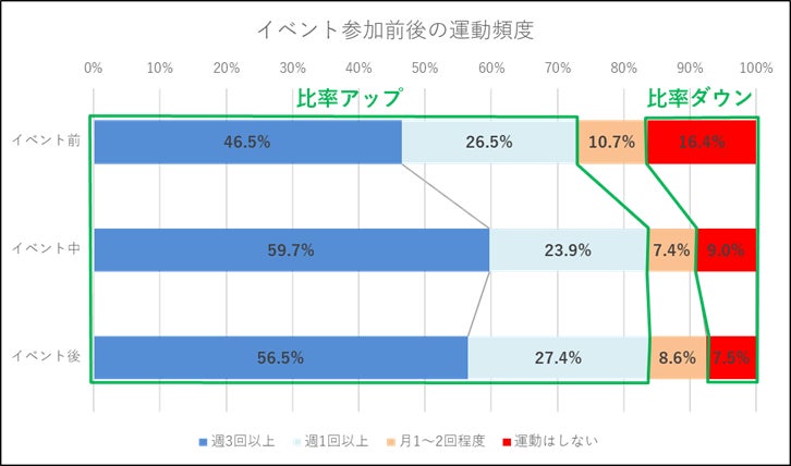 さらに、「運動はしない」と回答した人の比率は、イベント前→イベント中→イベント後となるにつれて下がっています。