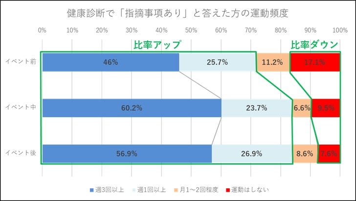 健康診断の結果に関するアンケートで「指摘事項あり」と回答した人に限定して見ても、同様の傾向となっており、運動習慣の改善がより望まれるこれらの方々に対しても、やはりイベントが運動意識の変化のきっかけになっていることが分かりました。
