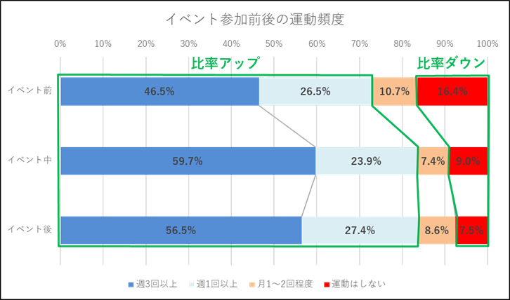 さらに、「運動はしない」と回答した人の比率は、イベント前→イベント中→イベント後となるにつれて下がっています。