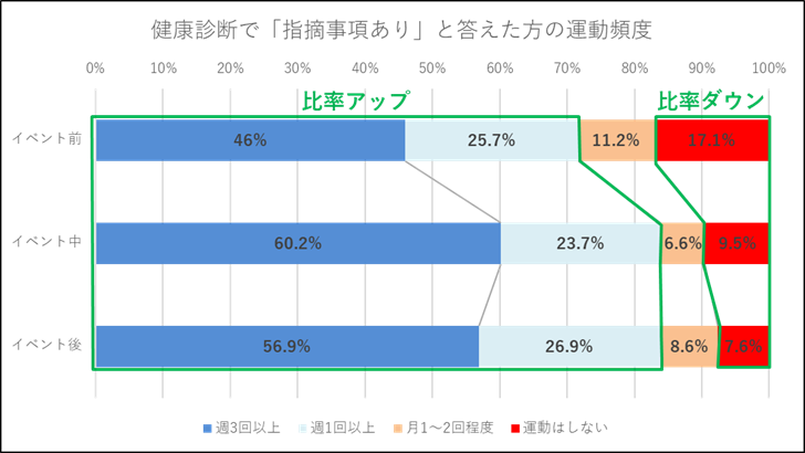 健康診断の結果に関するアンケートで「指摘事項あり」と回答した人に限定して見ても、同様の傾向となっており、運動習慣の改善がより望まれるこれらの方々に対しても、やはりイベントが運動意識の変化のきっかけになっていることが分かりました。