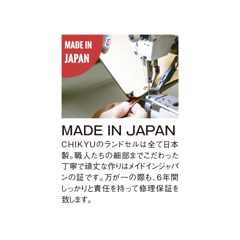 CHIKYUのランドセルは全て日本製。職人たちの細部までこだわった丁寧で頑丈な作りはメイドインジャパンの証です。万が一の際も、6年間しっかりと責任を持って修理保証を致します。