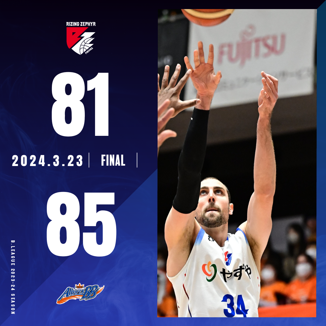 2024年3月23日(土)に開催されました【ライジングゼファーフクオカvs.新潟アルビレックスBB】において“福岡81-85新潟”の結果となりましたことお知らせいたします。