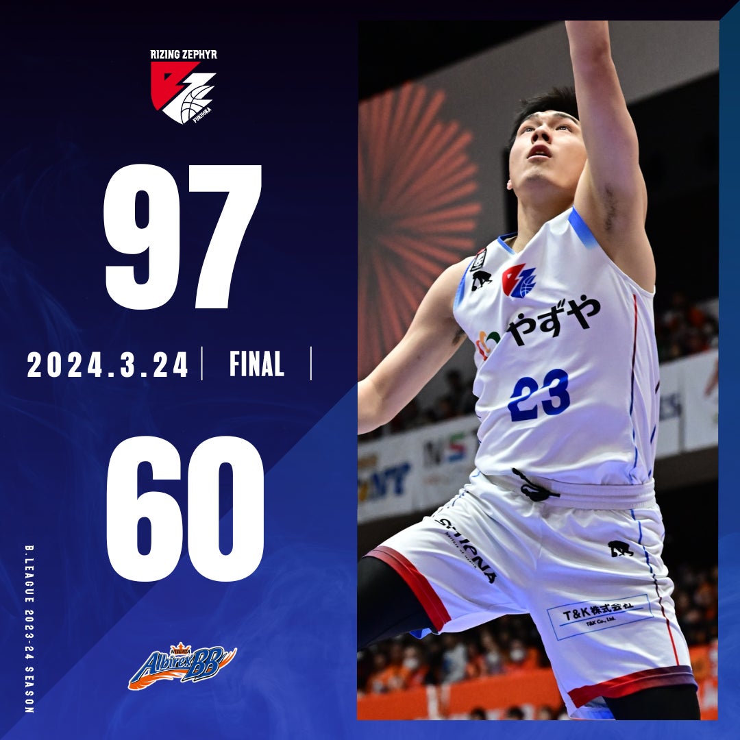 2024年3月24日(日)に開催されました【新潟アルビレックスBBvs.ライジングゼファーフクオカ】において“福岡97-60新潟”の結果となりましたことお知らせいたします。
