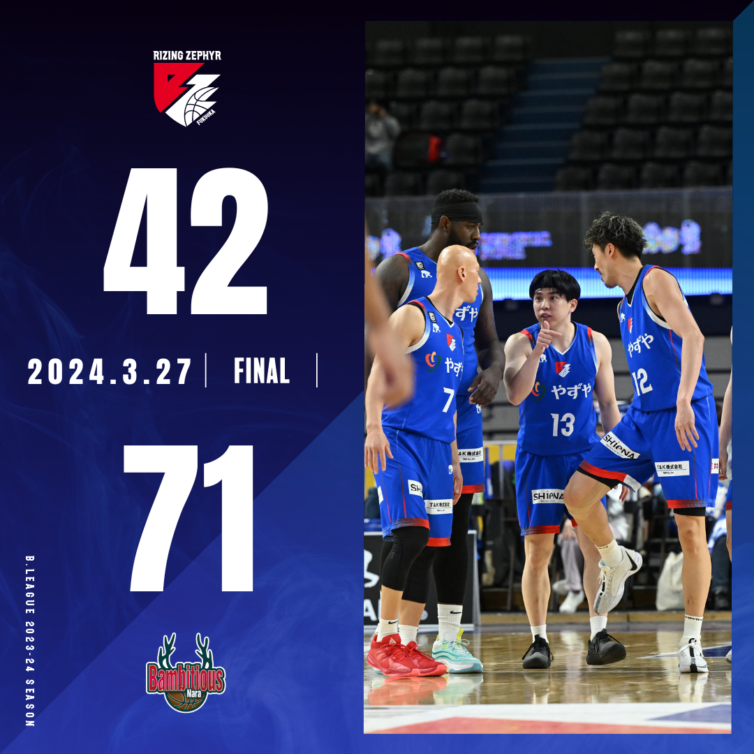 2024年3月27日(水)に開催されました【ライジングゼファーフクオカvs.バンビシャス奈良】において“福岡42-71奈良”の結果となりましたことお知らせいたします。