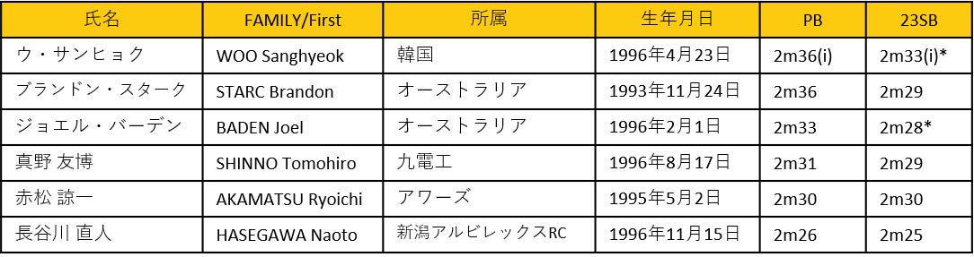 また、東京2020オリンピック5位入賞でウに並ぶ2m36の自己記録を持つブランドン・スターク(オーストラリア)、昨年大会2位で2m33の自己記録を持つジョエル・バーデン(オーストラリア)も出場予定です。