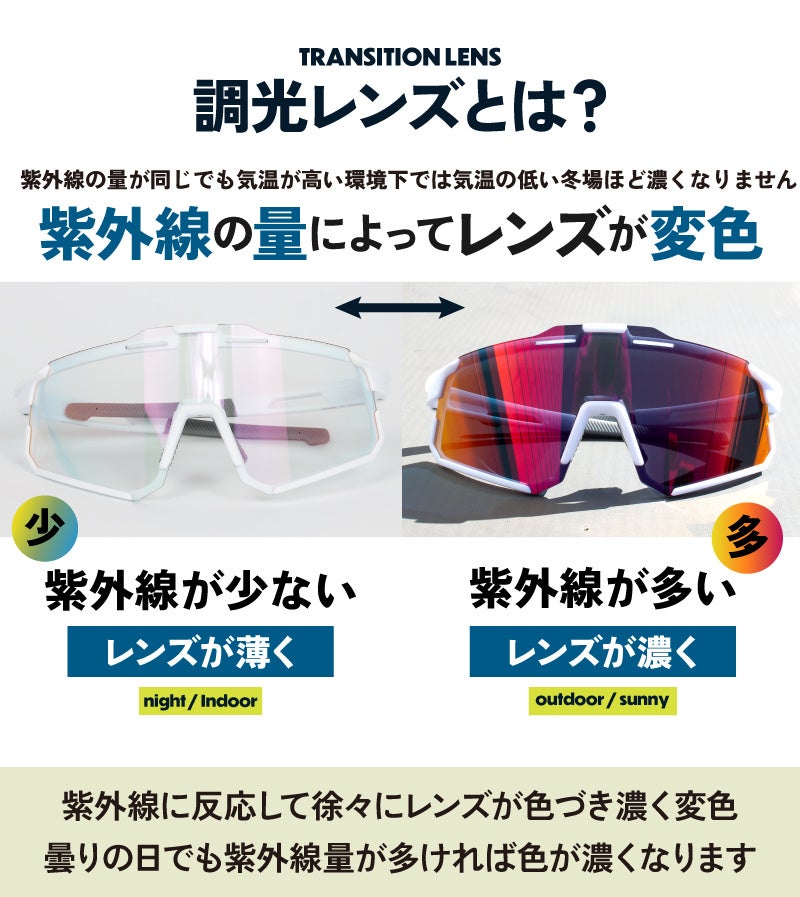 太陽光や紫外線から目を保護しつつ暗くなっても使える機能的な調光サングラスです。