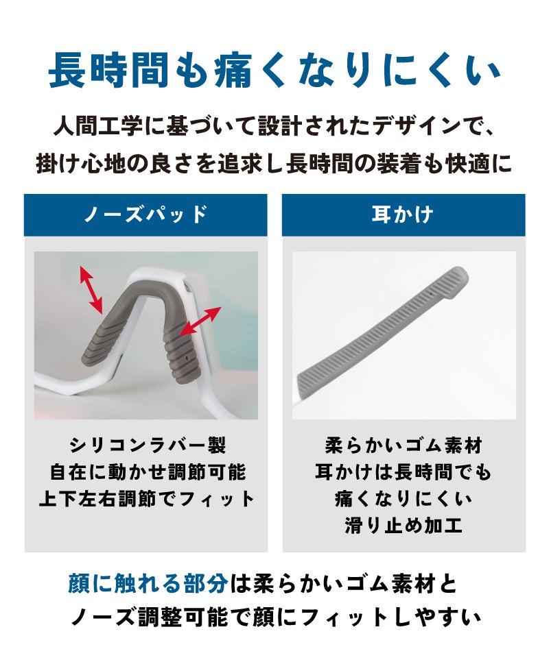 軽量で顔に触れる箇所は柔らかい素材になっているので長時間の装着も痛くなりにくいです。