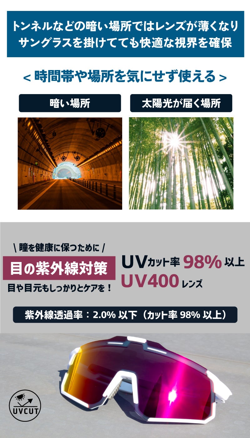 太陽光や紫外線から目を保護しつつ暗くなっても使える機能的な調光サングラスです。