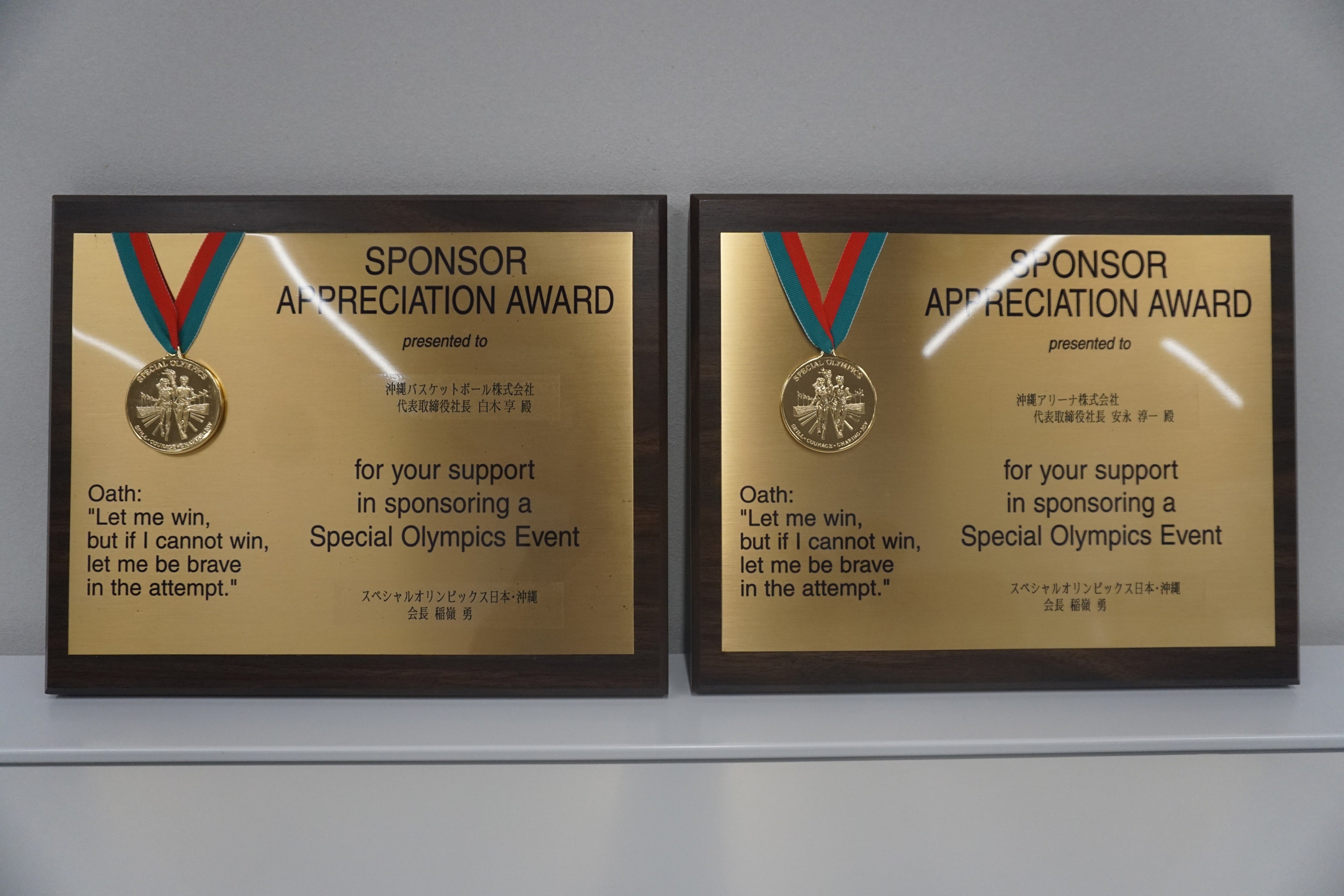 この度、3月29日(金)にスペシャルオリンピックス日本(以下SON)・沖縄より沖縄アリーナ株式会社と沖縄バスケットボール株式会社へ、「感謝の盾」を贈呈いただきました。