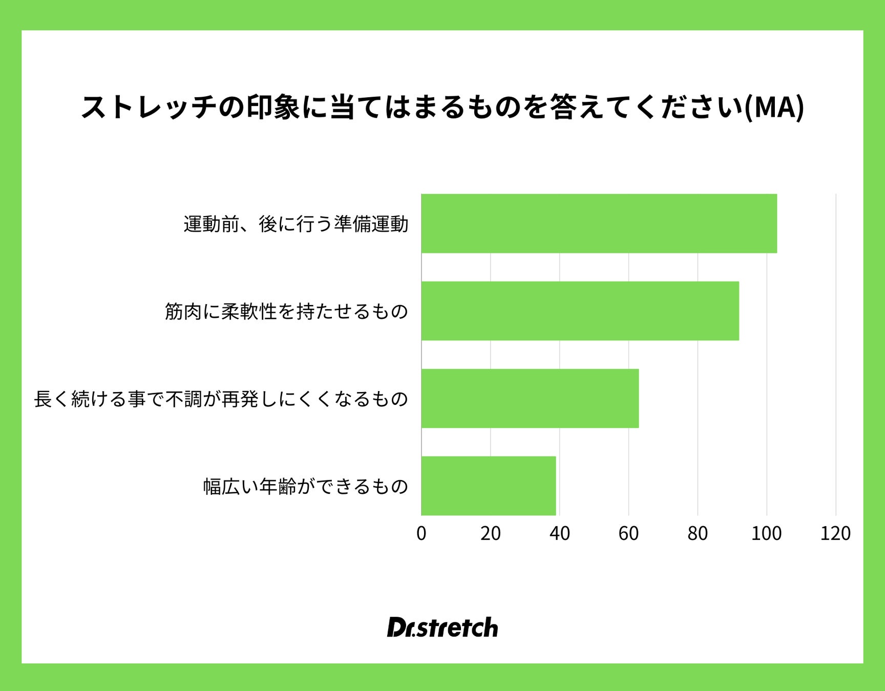 しかしながら、今回の調査結果をみると、ストレッチに対する印象として「長く続ける事で不調が再発しにくくなるもの」と答えた人は半数に届かず、まだストレッチの本来の機能は浸透していないことが見られました。