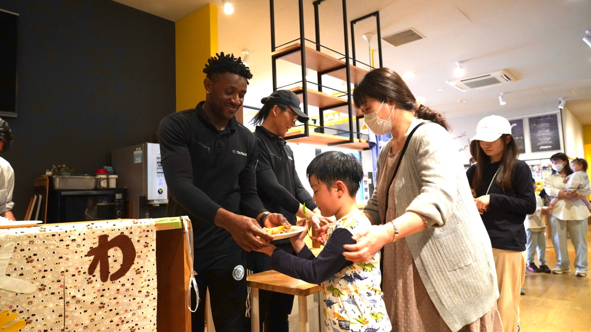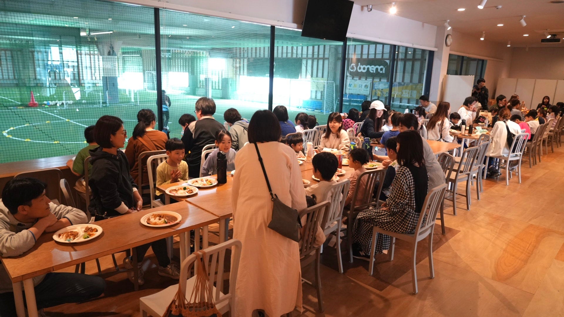 運動後はおおくわこども食堂スタッフとTSUTSUJI株式会社の従業員の方々が準備してくださった食事をカフェスペースにていただき、団欒の時間を過ごしました。毎年ご参加いただいているご家族もおり、「このイベントの開催を毎回楽しみにしています!」と開催を喜ぶ声もいただきました。