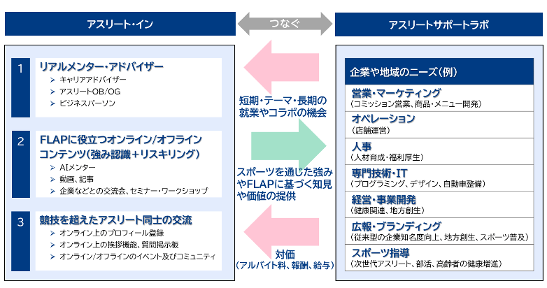 「アスリートFLAP支援(AFS)サービス」は、アスリートと引退した元アスリートに対して、キャリア自律に向けたサポートを提供するための事業です。