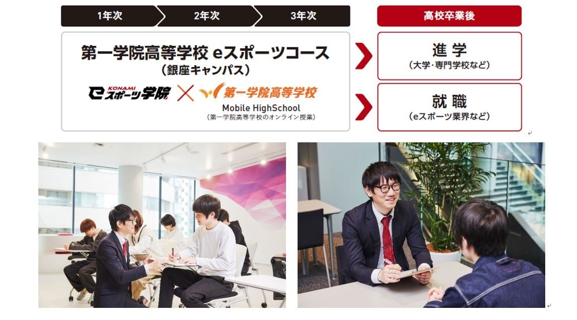 「KONAMI e スポーツ学院」は KONAMI が運営する e スポーツスクールです。 「第一学院高等学校」のサポート校、 e スポーツコースとして高校卒業資格の取得を目指しながら e スポーツ 界で活躍できる人材になるためのカリキュラムを提供します。 3年間を通じて、e スポーツのゲームスキルだけでなく、集中力、思考力、協調性など、人間的な成長につなが る様々な力を伸ばし、将来の選択肢を広げます。。