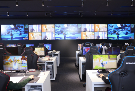 実技ルームには、40 台のハイスペックゲーミング PC を始め、ゲーミングモニター、ゲーミングチェア、低 Ping 値の高速インターネット回線を完備。14 面のマルチスクリーンで、複数の生徒のプレイもリアルタイムにチェッ ク可能です。一方で、SNS 講座や IT の基礎知識、イベントの企画運営からセルフケア・コミュニケーションに 至るまで、幅広い座学を学ぶための講義ルームは、明るく開放的な設計。リラックスしながら積極的なコミュニ ケーションが促進される空間です。
