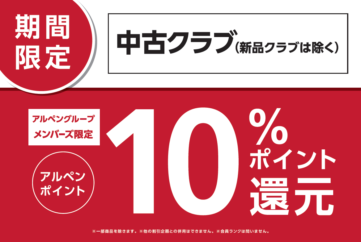 4月12日~4月22日の期間で、中古クラブのお得なセールを開催いたします。お買い得品を多数ご用意するほか、アルペングループメンバーズ会員様限定で、中古クラブ購入時にアルペングループポイントが10%ポイント還元となるキャンペーンを実施いたします。