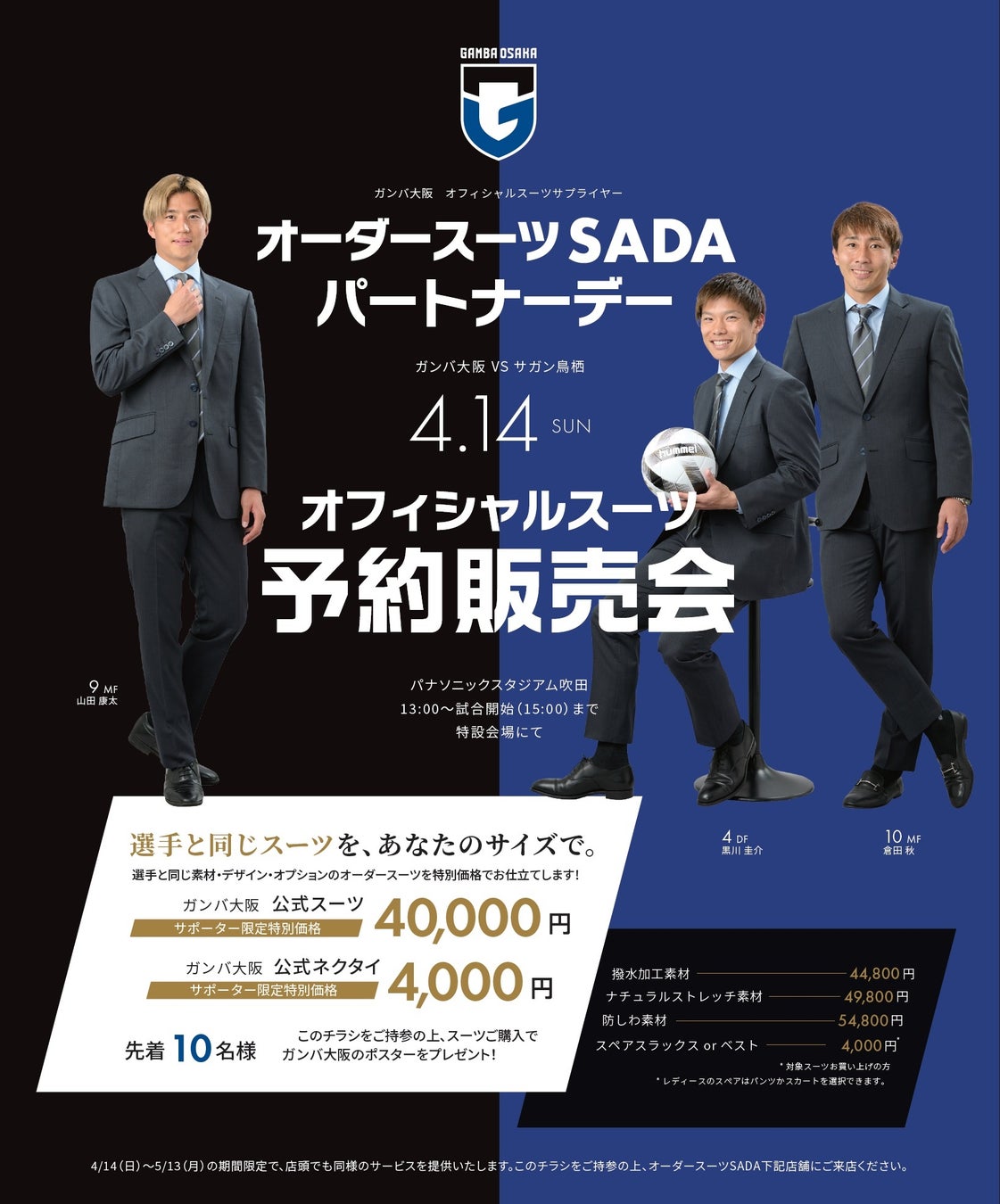株式会社オーダースーツ SADA(本社:東京都千代田区、代表取締役社長:佐田展隆)は、2024 年 4 月 14 日(日)に『オーダースーツ SADA スペシャルデー』にてオフィシャルスーツの予約販売会 を、13:00~試合開始(15:00)までパナソニックスタジアム吹田 特設会場で開催いたします。オー ダースーツ SADA は、オフィシャルスーツサプライヤーとしてガンバ大阪を応援しています!