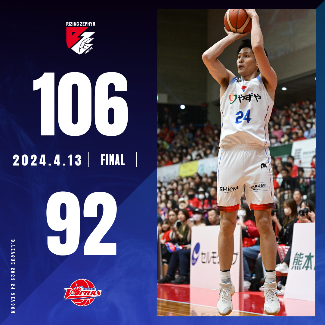 2024年4月13日(土)に開催されました【熊本ヴォルターズvs.ライジングゼファーフクオカ】において“熊本92-106福岡”の結果となりましたことお知らせいたします。