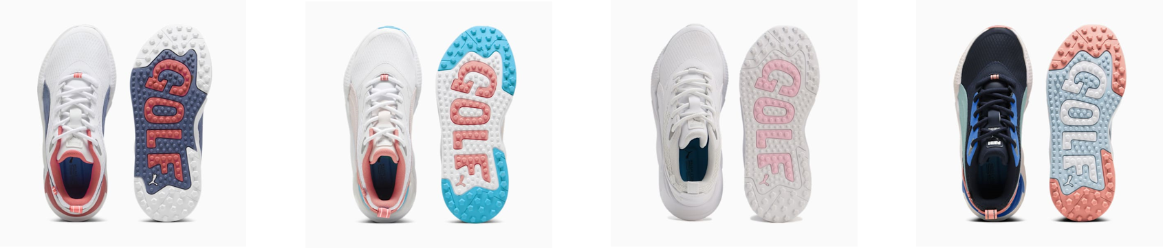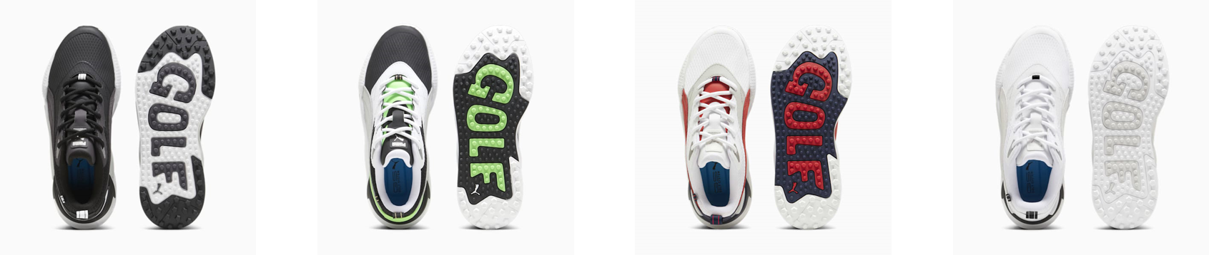 コンセプトは「厚底シューズに合うニュースタイリング」となっております。プーマの⼤⼈気商品となっている厚底スニーカーをインスパイアした厚底ゴルフシューズに合うデザイン、カラー、シルエットが最⼤の特⻑です。また 24 年春夏より厚底ゴルフシューズがバージョンアップ。GS X エフェクトと新たに名前も変わり、アッパーがメッシュ素材となり、カジュアルスタイルに合わせやすく、フィット感が向上しました。ゴルフシューズとしての機能性を発揮しながら、オンオフどちらでも履けるスタイリッシュなゴルフシューズとなっております。