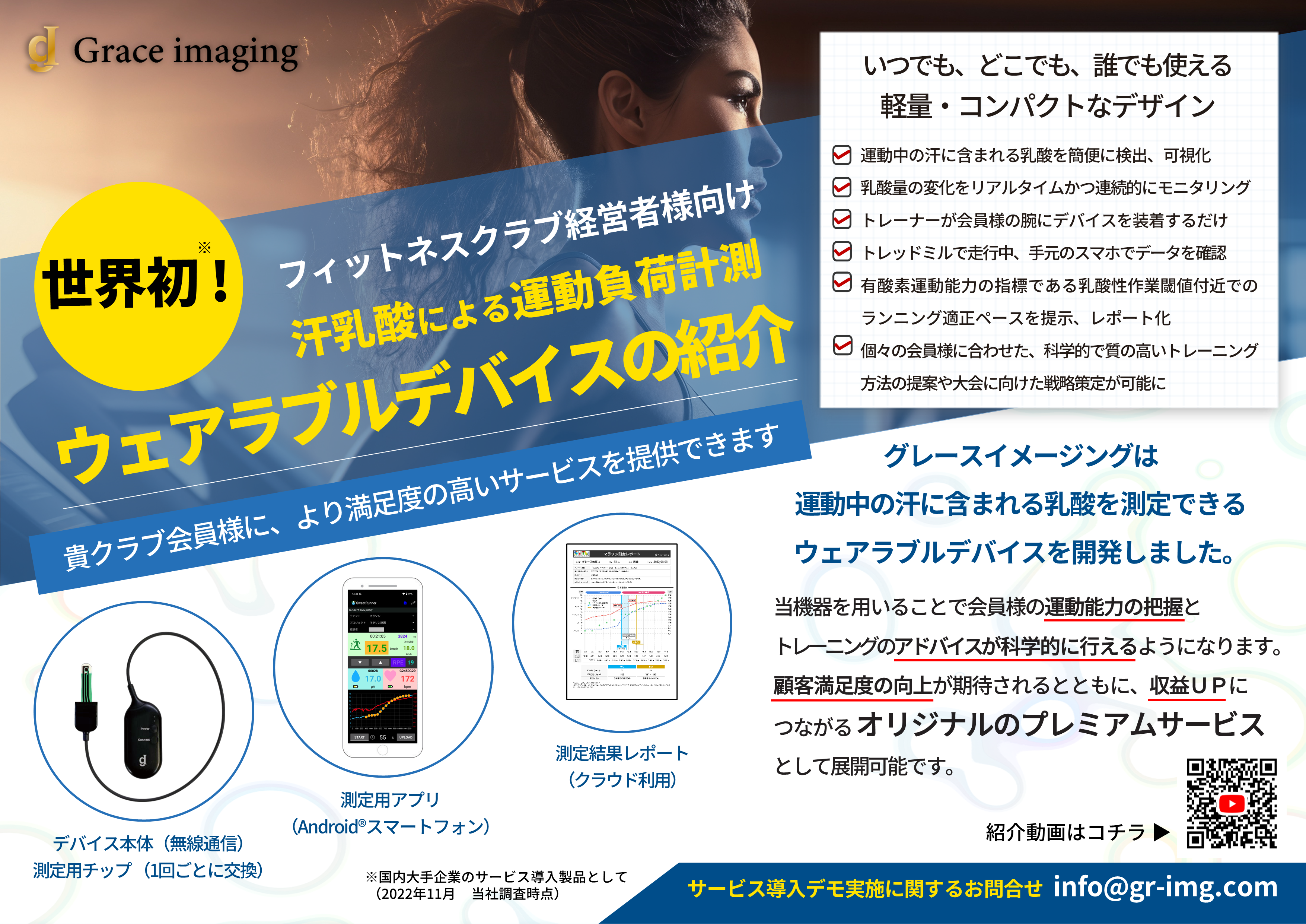株式会社グレースイメージング(以下、当社)は、これまでの活動で汗乳酸測定デバイス(汗乳酸センサ)を、各種スポーツにおける「疲労」を可視化するツールとして開発してきました。様々な大学、研究機関、企業への導入を進めており、2022年度よりミズノスポーツサービス株式会社様のランナー向けサービス事業に対し汗乳酸センサを提供しています(https://prtimes.jp/main/html/rd/p/000000006.000054709.html)。