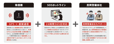 警備会社、さらには公的救助機関の協力によって「HITOCOCO」が発する専用電波を探知し、捜索・発見することも可能となるのです。