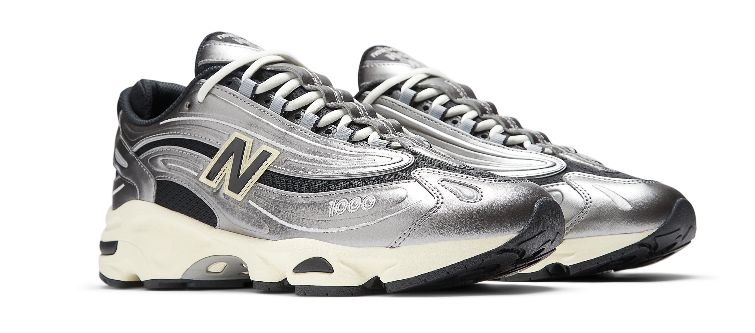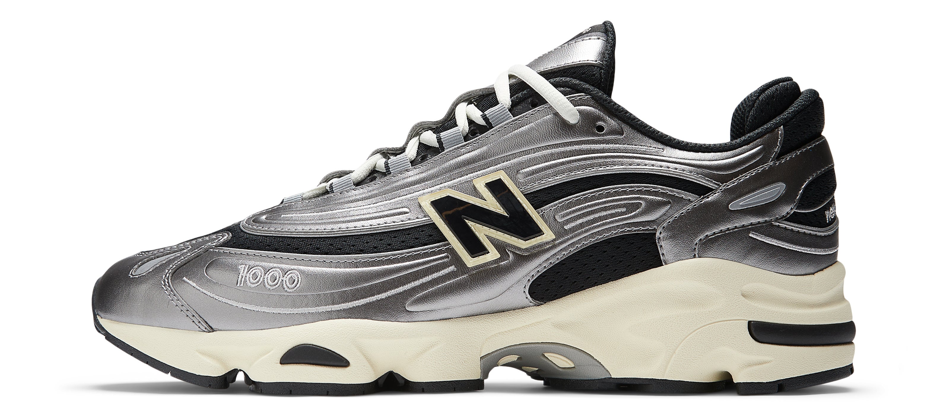 パフォーマンスランニングシューズからインスパイアされた、ブラックの エアーメッシュと、シルバーメタリックのシンセティックレザーの波状のオーバーレイを組み合わせたコンビネーションアッパーに、高い衝撃吸収性を実現したABZORB(アブゾーブ)を搭載したミッドソール、中足部に軽量で快適な履き心地とサポートするスタビリティウェブを採用、履き口内部のフォームヒールパッドにより、しっかりと固定されたフィット感を提供し、快適性を高めています。つま先のサイドに「1000」、ヒールタブに「N」を刺繍したブランディングでディティールをブラッシュアップ、流線的なシルエットや、彫刻的なミッドソールの形状、メタリックなカラーリングは、Y2Kタッチなデザインで仕上げています。