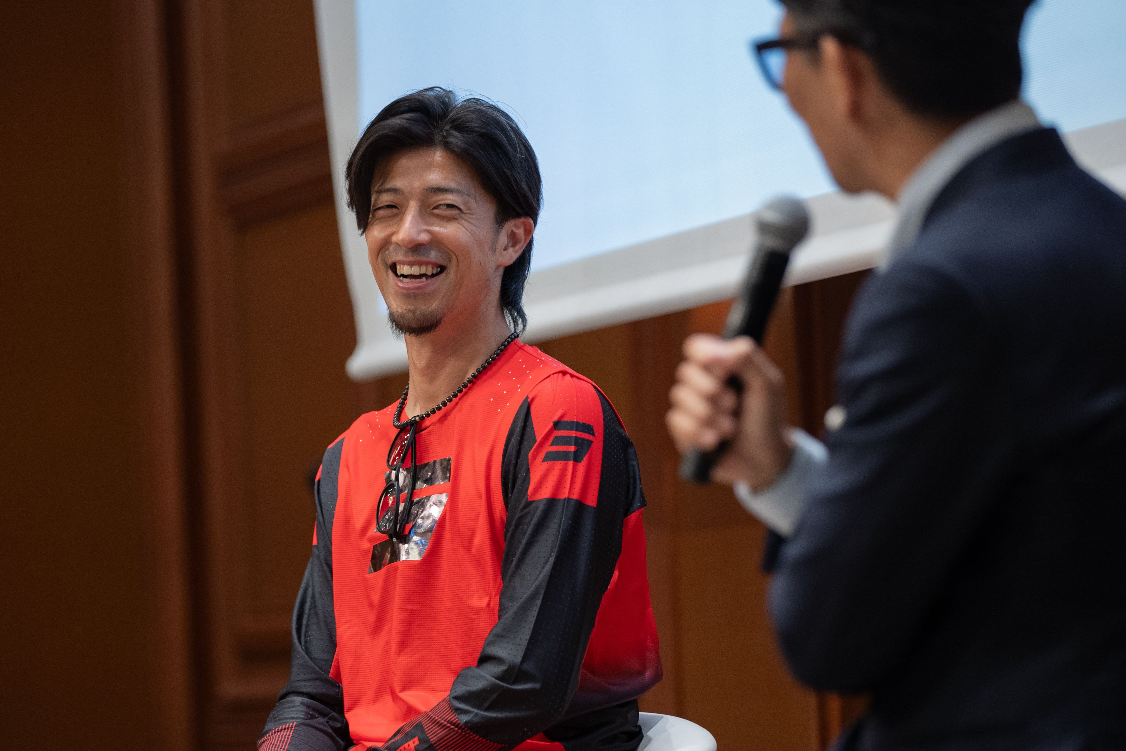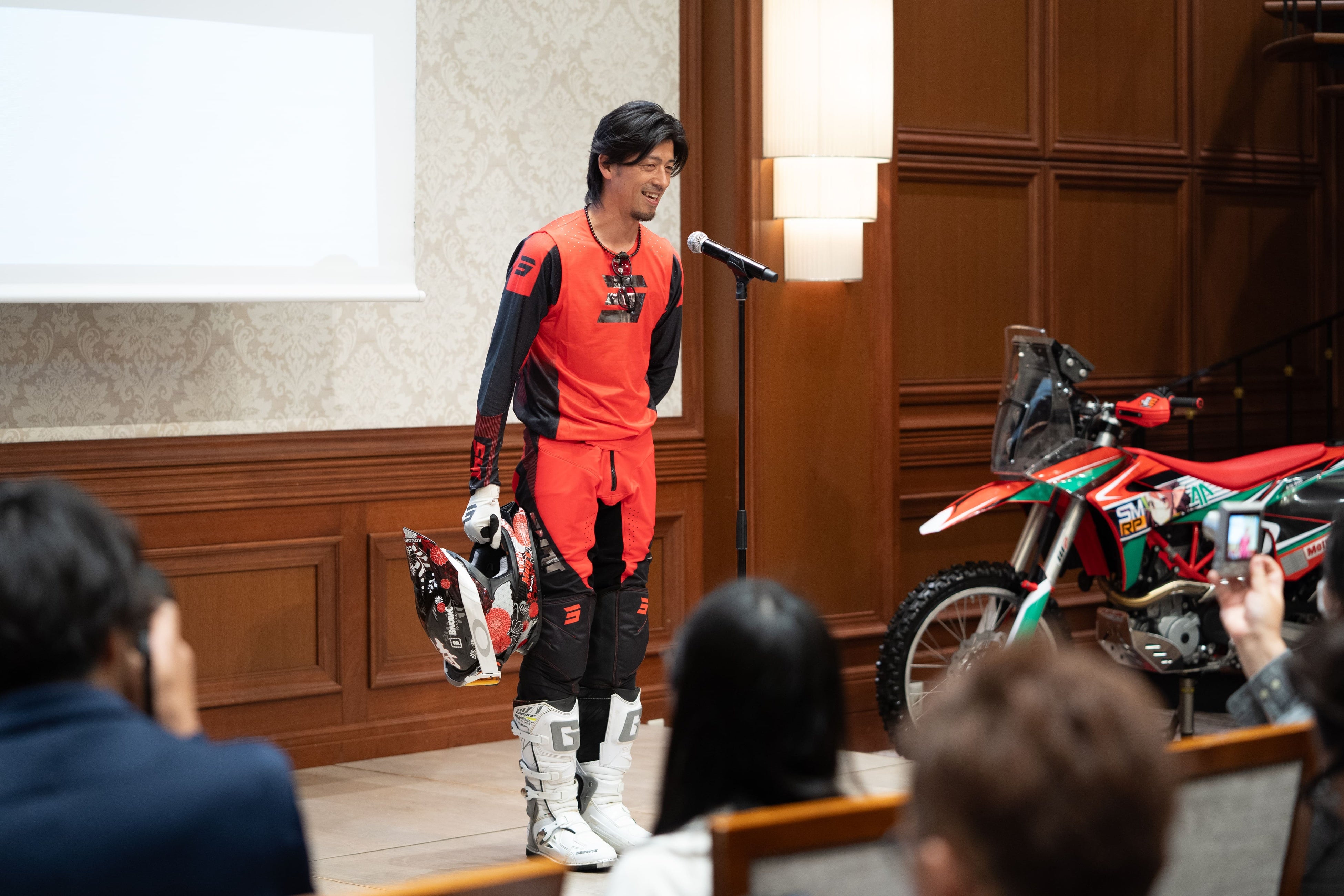 挨拶の後、壇上で松尾社長とトークを展開。その中で、MCから松尾製作所によるプロジェクトの目標達成に向けた体制を聞かれると、「全てのオフロードライダーの憧れの先にあるのがダカール・ラリーです。このレースに挑戦することができる人は限られている中で、私の挑戦が松尾製作所様によるサポートのお陰で実現でき、とても嬉しいです。松尾製作所様にはメインスポンサーという枠組みを超えて、私の人生を応援してくださる姿勢、にとても感謝しています。松尾製作所の社員の皆様と共に”思いの火”を感じ起こし、完走を果たしたいです。」とコメント。