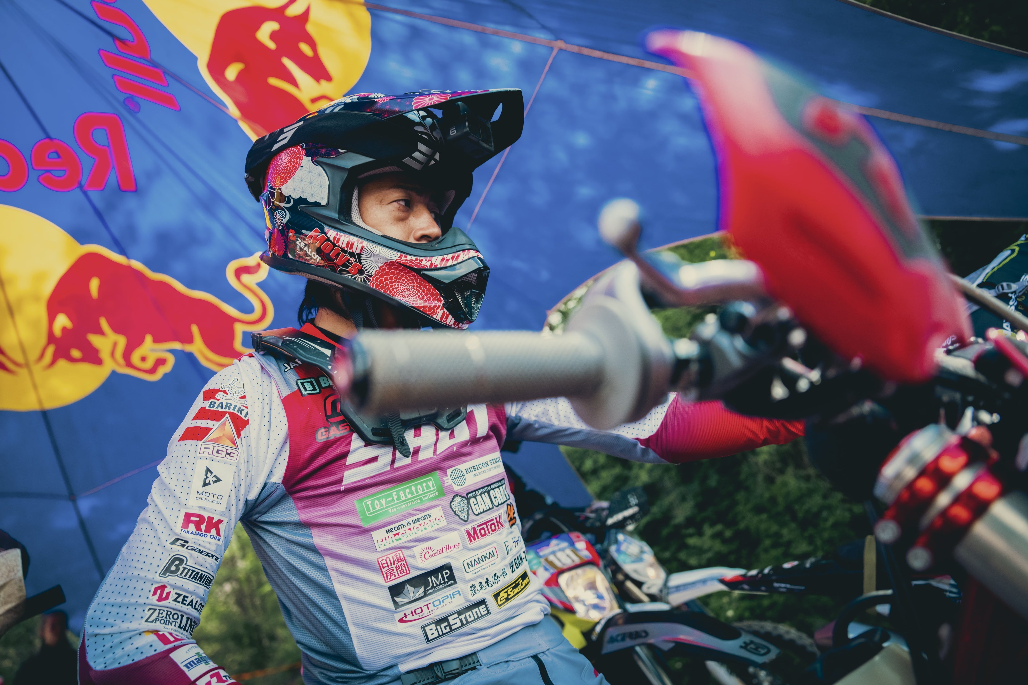 藤原慎也は、2014年に国際A級シリーズチャンピオンを獲得するなど、国内トップのトライアルライダーとして活躍している選手です。レースにおいてコースの障害物(丸太等)を超低空で刺すように飛び越えるスタイルで人気を博し、「ぶっ指し先生」という異名を持ちます。また、エクストリームなハードエンデューロとして知られる「Red Bull Erzbergrodeo」に、2度の出場を果たすなど、挑戦的な姿勢は、多くのファンや競技者からリスペクト、支持を得ている選手として注目されています。