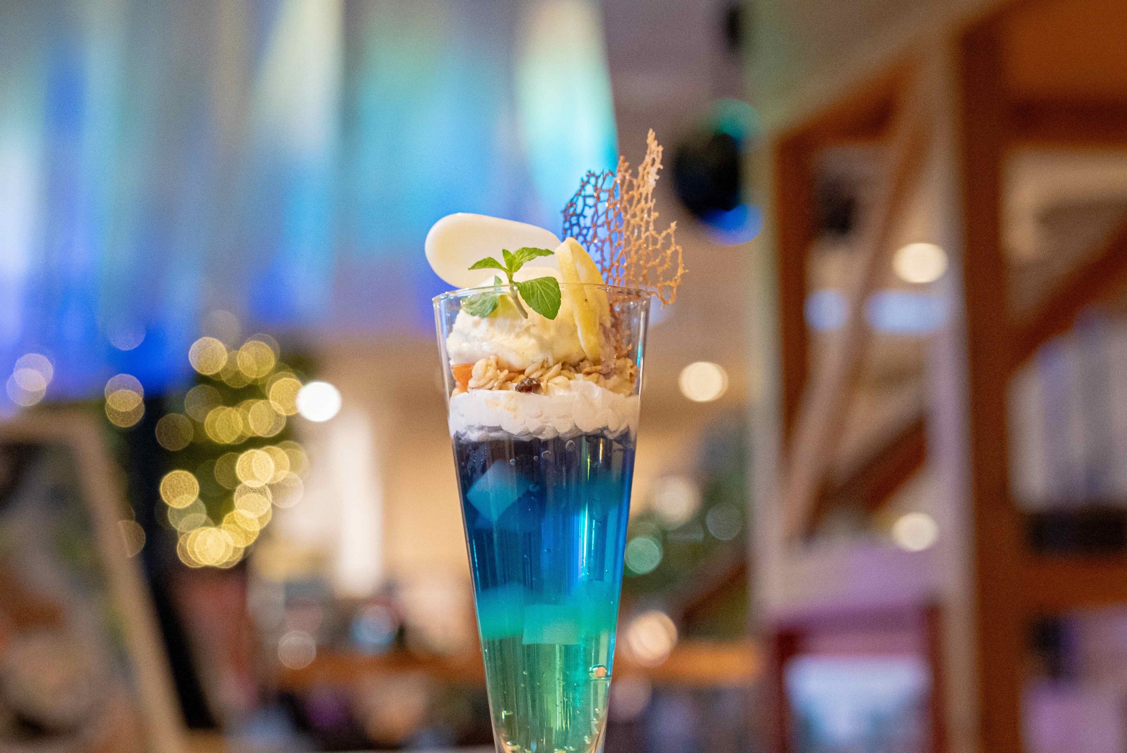 スイーツのおすすめはオーロラパフェ。北欧の夜空を彩るオーロラをイメージして、光の波長によるブルーやグリーンのグラデーションをゼリーで表現しました。ラウンジのオーロラが見える席で、ぜひ味わってみてください。