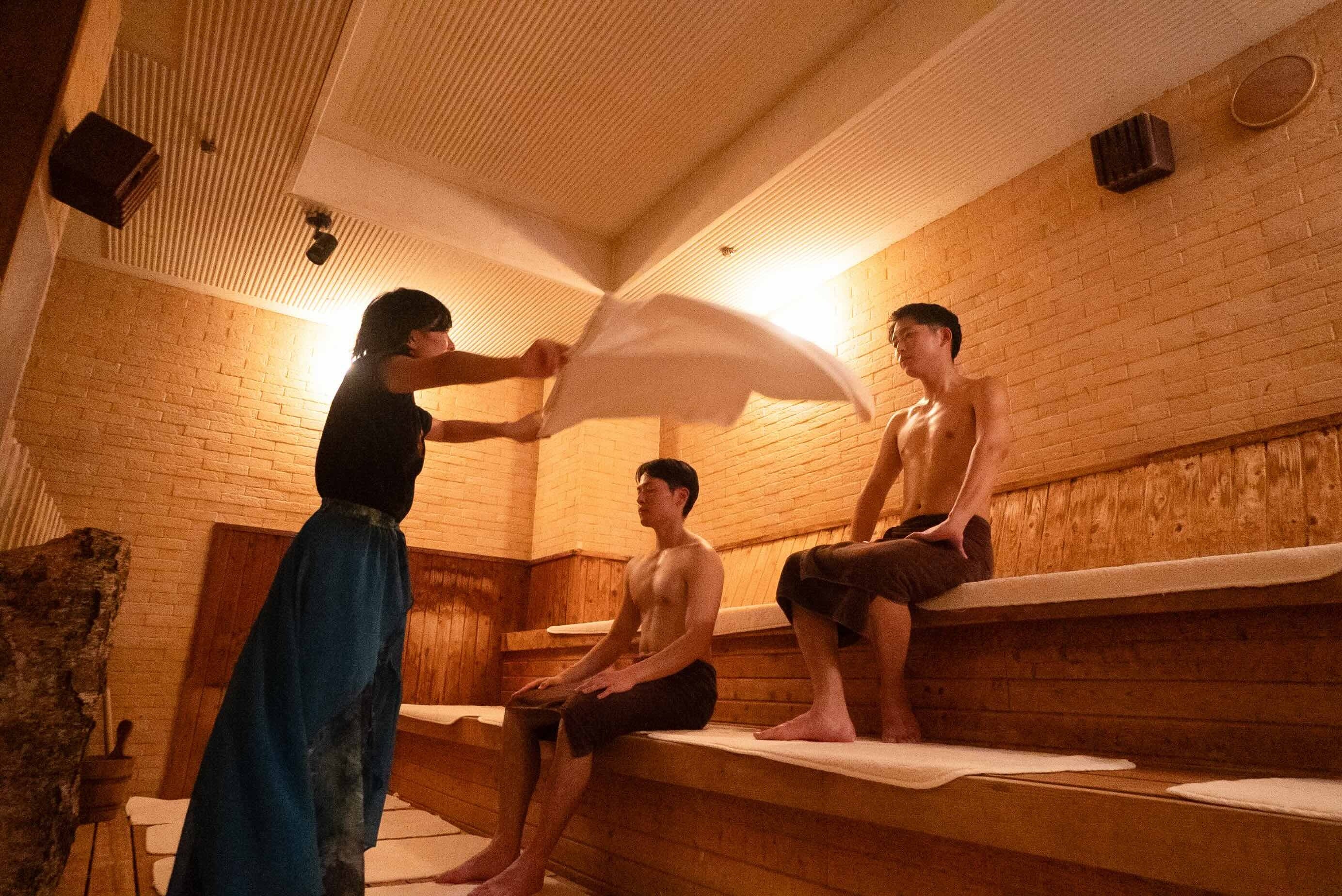 広々とした「イズネスサウナ」は、毎時間パワフルなオートロウリュが発生し、一気に発汗を促す高音ドライサウナ。ゴールデンウイーク期間中は毎日熱波・アウフグースイベントを開催します。
