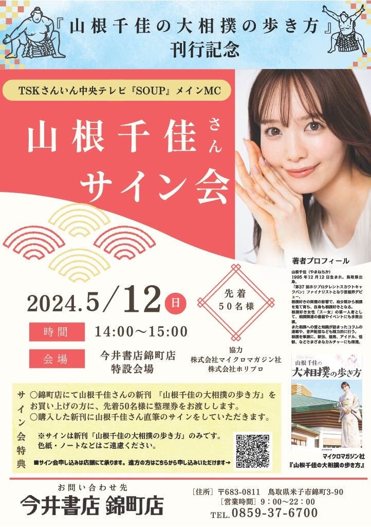 『山根千佳の大相撲の歩き方』(マイクロマガジン社)の刊行を記念し、山根千佳さんの地元・鳥取の書店、今井書店 錦町店にて5月12日(日)にサイン会(先着50名様)が開催されます。また、今井書店で『山根千佳の大相撲の歩き方』をご購入された方には限定でポストカードをプレゼントいたします。