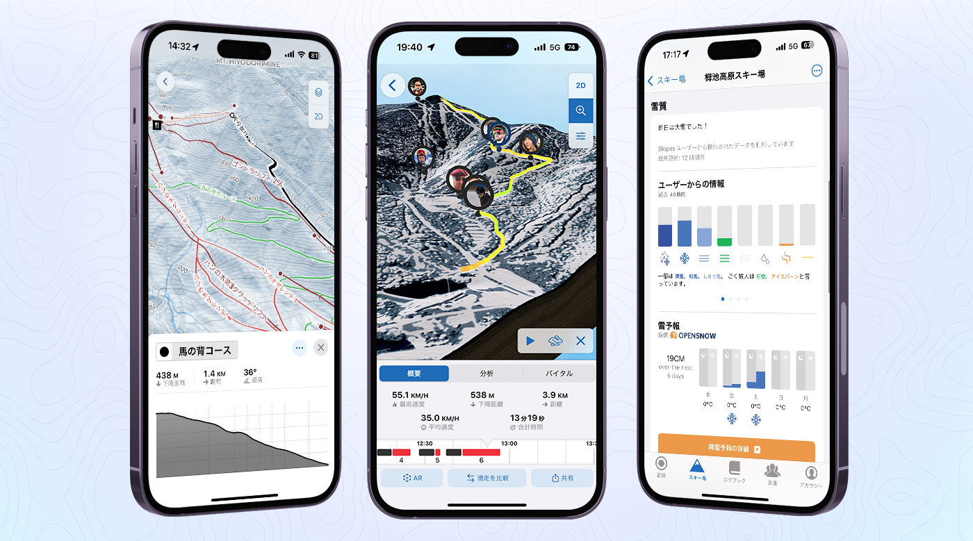 Slopesは日本のスキー場(約400箇所)を含む世界3500以上のスキー場に対応しており、ダウンロード数400万を超える世界で最も使用されているウィンタースポーツのトラッキングアプリです。スキーやスノーボードの滑走データをGPSを使用して記録し、滑走軌跡を3DやARのインタラクティブなマップ上で再現し、シーズン最高の滑りを振り返りましょう。