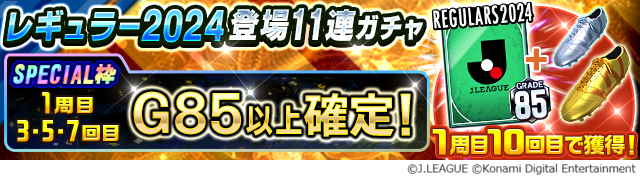 本キャンペーンでは、Jリーグ全40クラブから11選手ずつ総勢440名が、2024シーズンのJリーグデータで「レギュラーカード2024」として登場するほか、「G85以上ガチャ券」などが手に入る「Jクラゴールデンログインボーナス」や「お気に入りクラブG85以上レギュラー2024ガチャ券」などが手に入る「レギュラー2024登場11連ガチャ」も開催します。