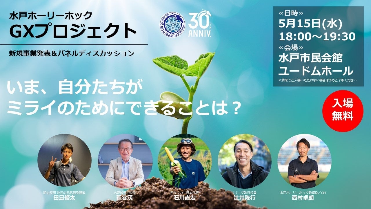 第1部では、水戸ホーリーホックが新たに挑戦するGX(グリーントランスフォーメーション)事業に関する発表を実施し、第2部では、バラエティに富んだパネラーの方々をお招きしパネルディスカッションを行います。