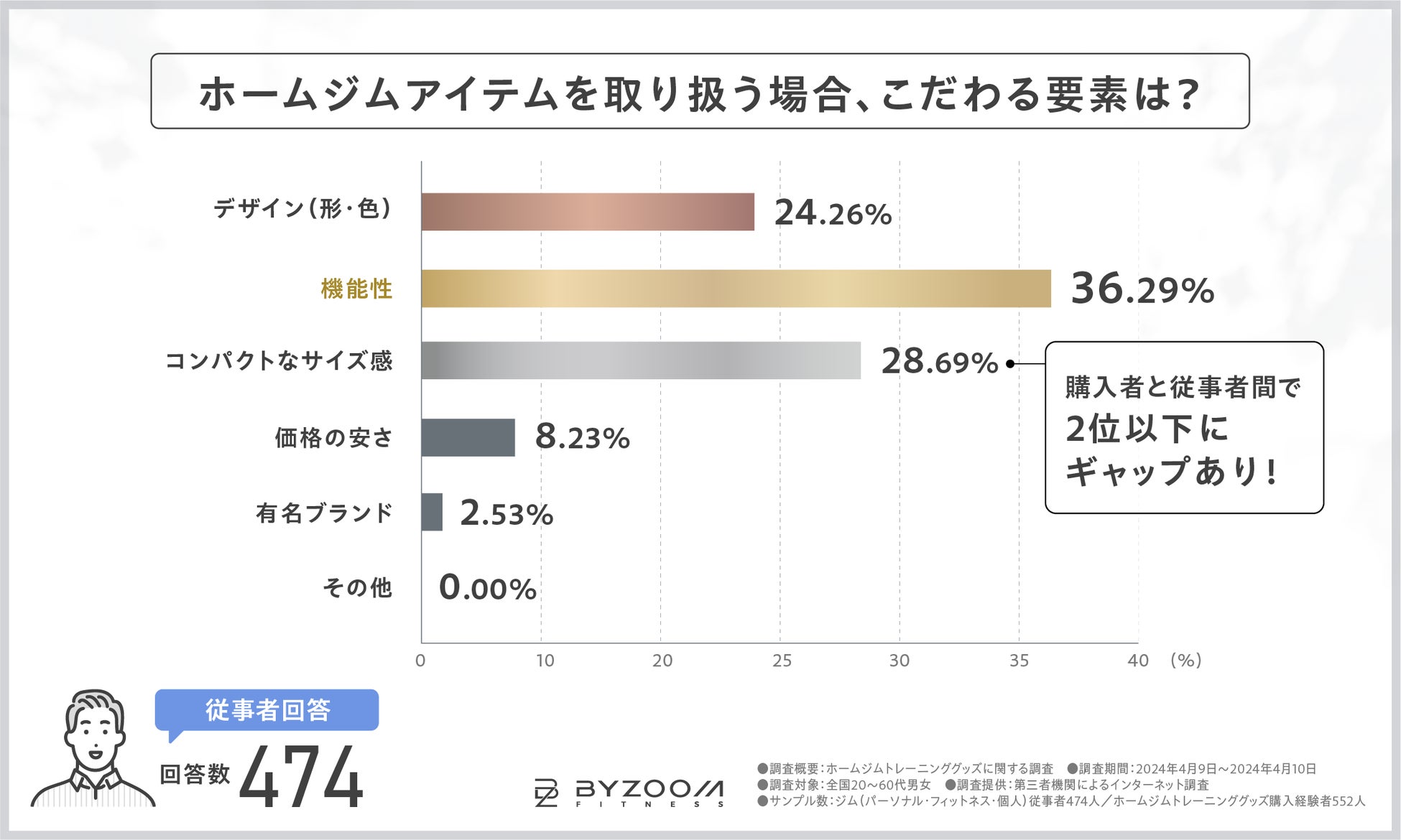 収益や顧客満足の大事な要因になっているホームジムアイテムを店頭にラインナップする際のこだわりをアンケートしたところ、「利用者とのギャップ」が明確になるアンケート結果が得られました。