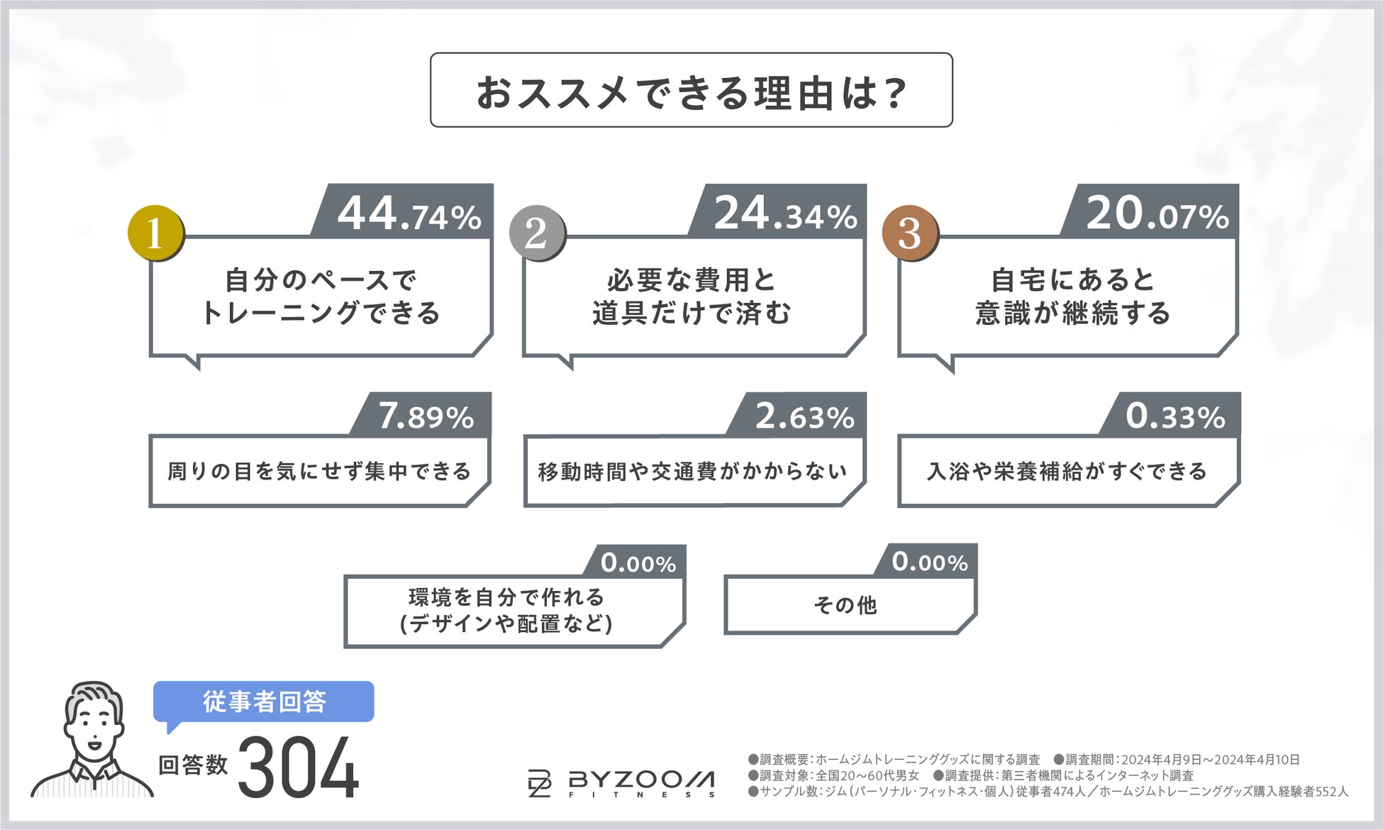 他にも「必要な費用と道具だけで済む(24.34%)」「自宅にあると意識が継続する(20.07%)」が、上位のおススメ理由のようです。