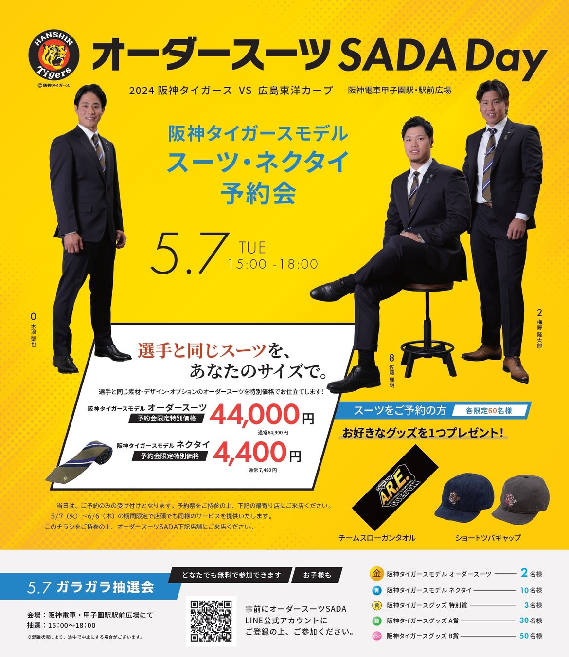 株式会社オーダースーツ SADA(本社:東京都千代田区、代表取締役:佐田展隆)は、2024 年 5 月 7 日(火)に、阪神タイガースモデル オーダースーツ・ネクタイの予約会を 15:00~18:00 まで、阪 神電車甲子園駅・駅前広場にて開催いたします。オーダースーツ SADA は、スーツサプライヤーと して阪神タイガースを応援しています!
