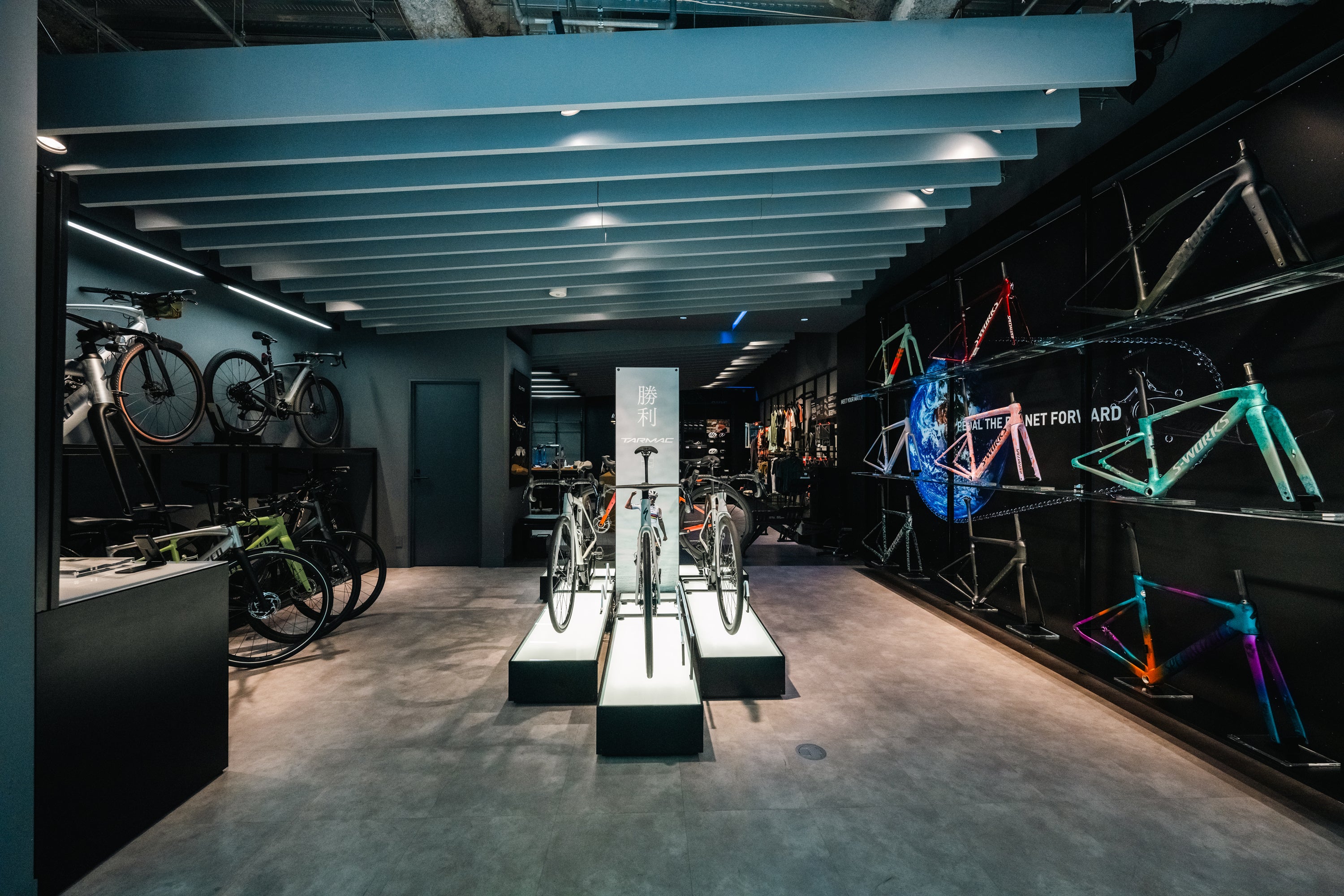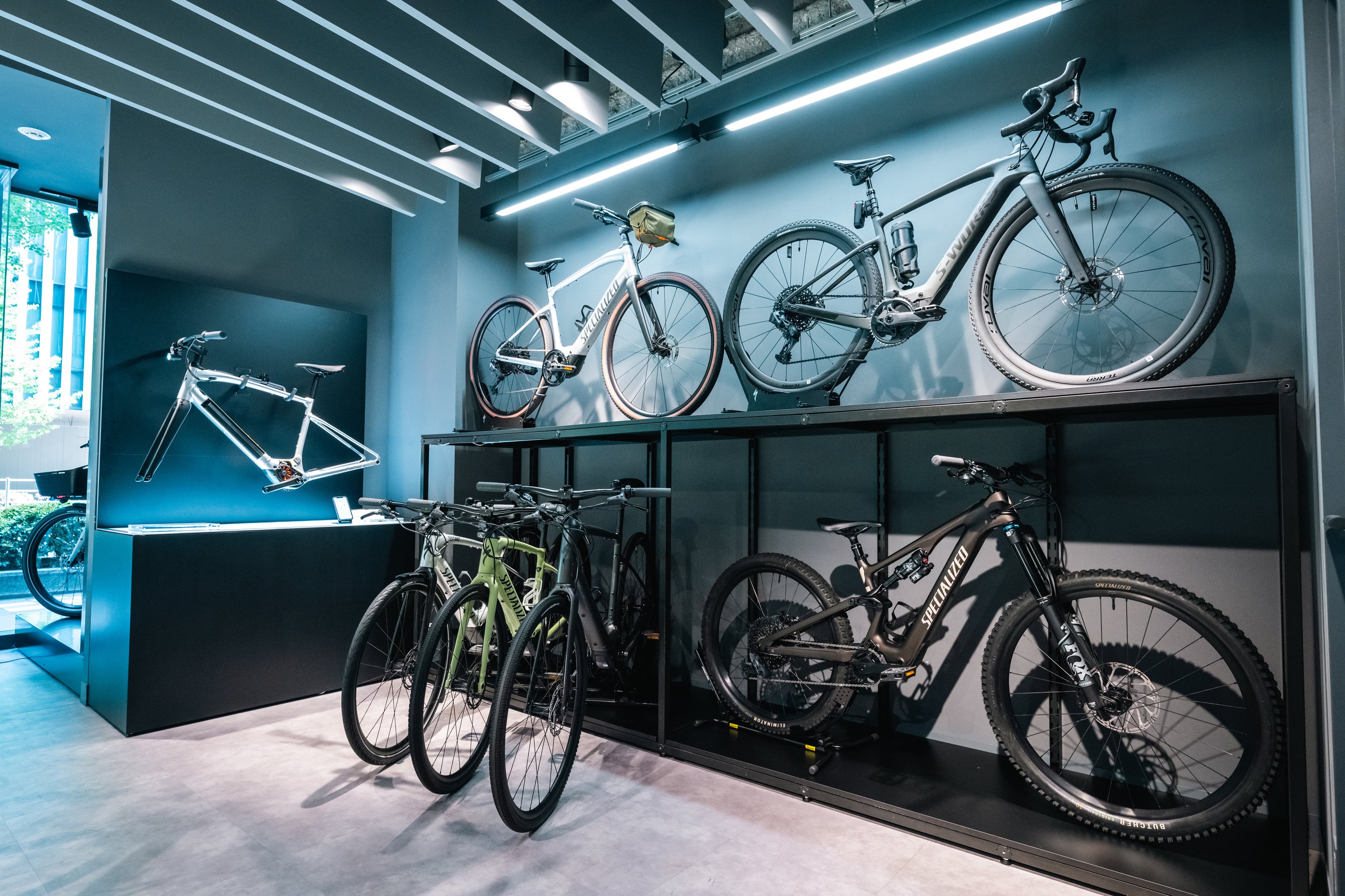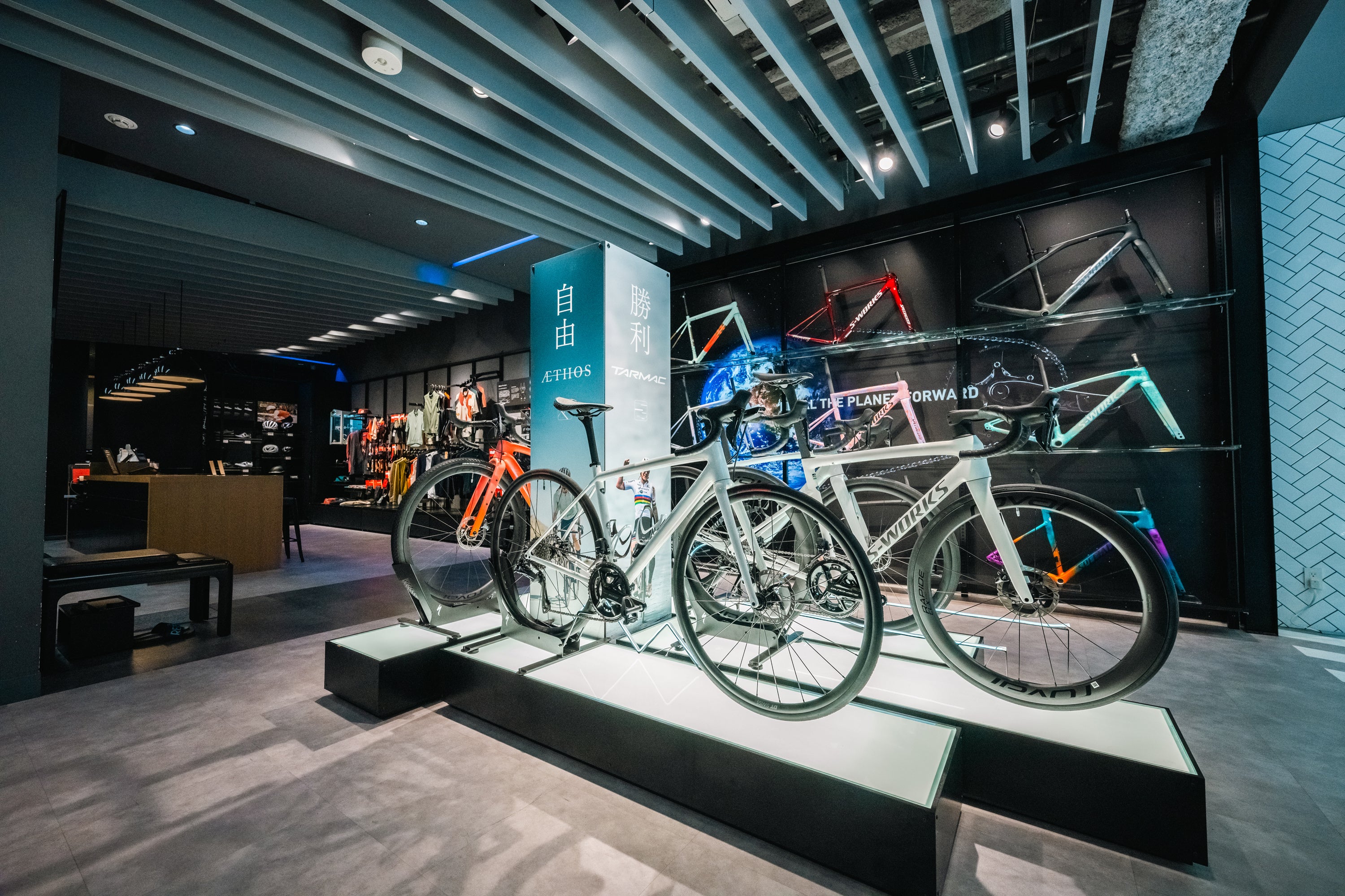 常に最先端のバイクを発信してきた同店は、コロナ渦以降のサイクリングシーンの変化に合わせ2024年春にリニューアルしました。人気のロードバイクユーザーや国内外の旅行客にスペシャライズドの革新性を体験していただくため、同社の中でも最新の技術がより多く詰まった最高峰グレードS-Worksを中心とした展示に生まれ変わりました。1974年に設立されたスペシャライズドは今年で50周年。ショッピングのみならず、同社のこれまでの道程と、これからのサイクリングシーンを発信していく拠点となります。