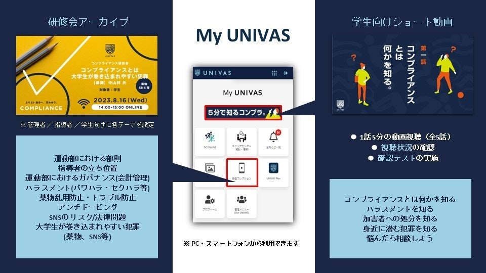 会員向けサービス「My UNIVAS」では、オンライン研修会のアーカイブ動画を視聴いただけます。万が一出席できなくても、好きな時間にコンプライアンスを学ぶことが可能です。