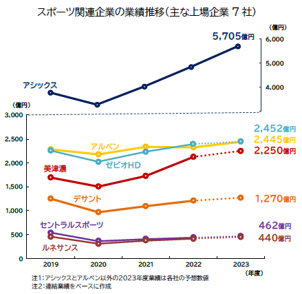 スポーツ関連(スポーツ用品製造業、卸・小売業、フィットネスクラブ)の主な上場企業7社の業績をみると、2022年度は6社が増収となり、2023年度は全社が増収または増収予想としている。